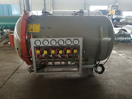 在工作的过程中罐内会有抽真空的步骤,一般来讲该设备都是多路抽真空的,罐外可以看到有着一排的真空表进行每一个管路进行抽真空,我们为了让压力达到我们想要的结果还要对罐内进行加压,压力作用于制品上这样就能更快的渗透和固化使得整个热压固化过程加速,一般来说现在的热压罐都是高压热压罐。